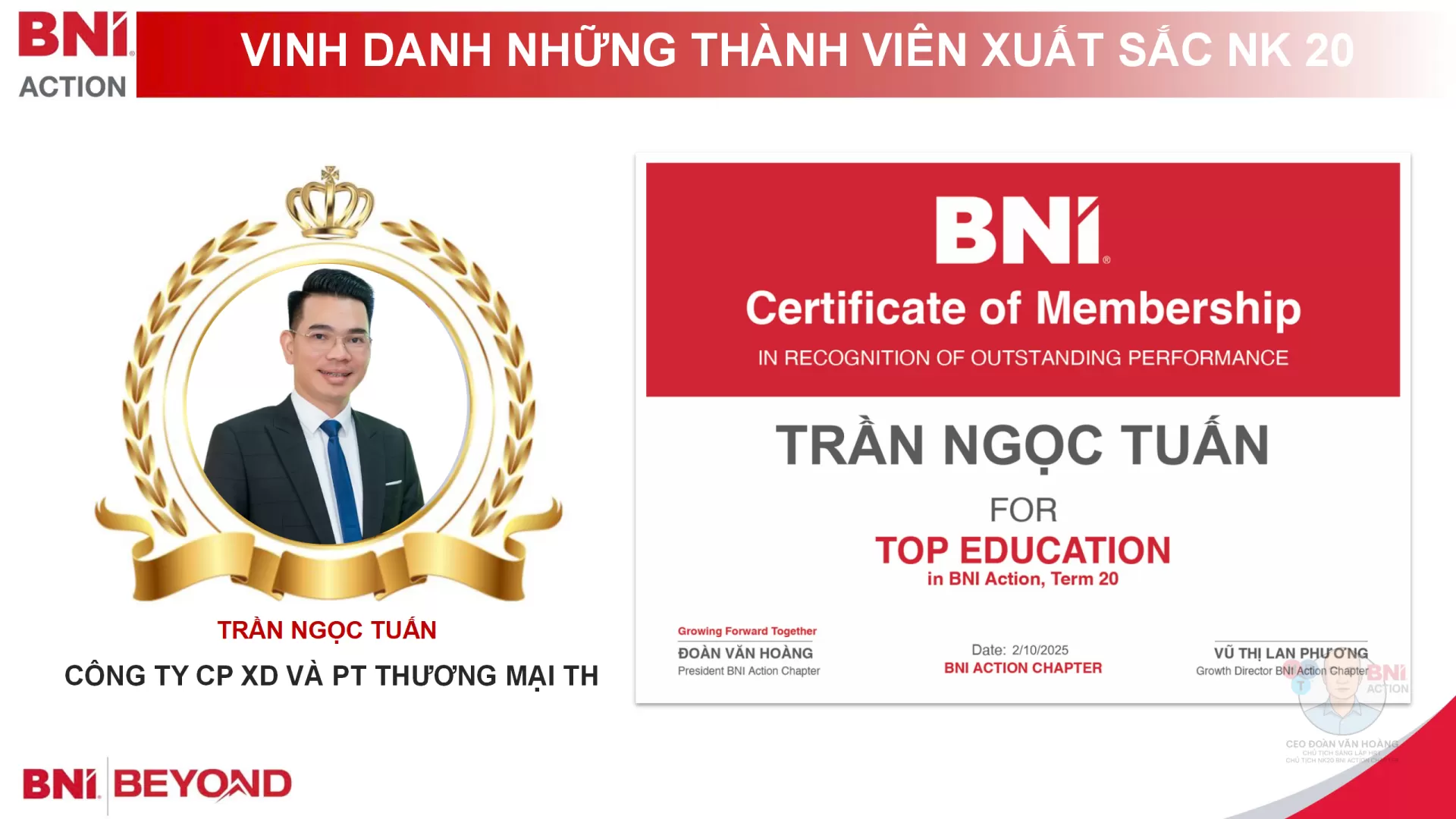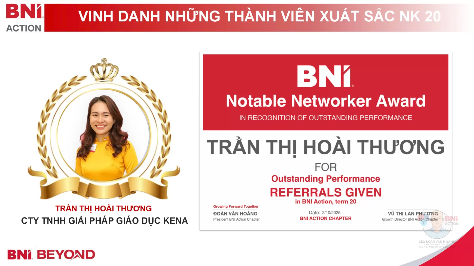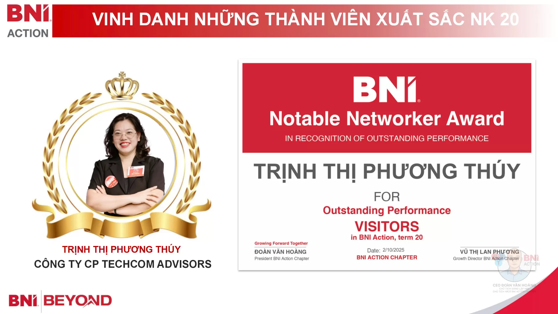 Trong buổi lễ, BNI Action Chapter đã trang trọng vinh danh các cá nhân tiêu biểu – những thành viên không chỉ hoạt động năng nổ mà còn lan tỏa tinh thần học hỏi, cống hiến và gắn kết: