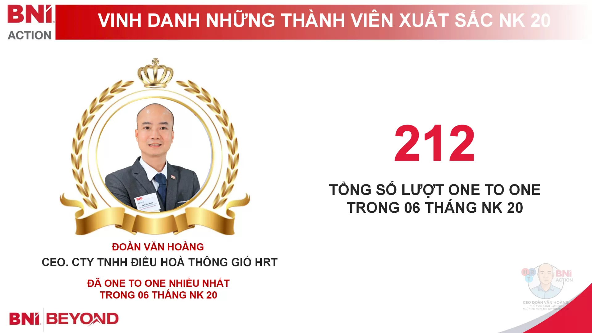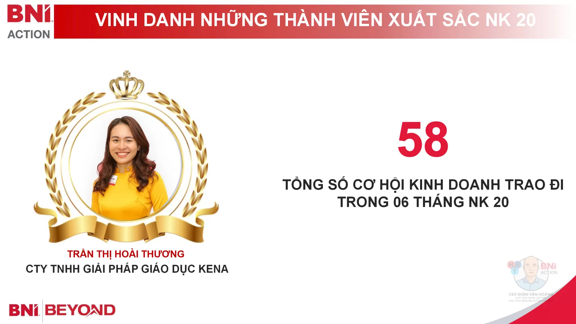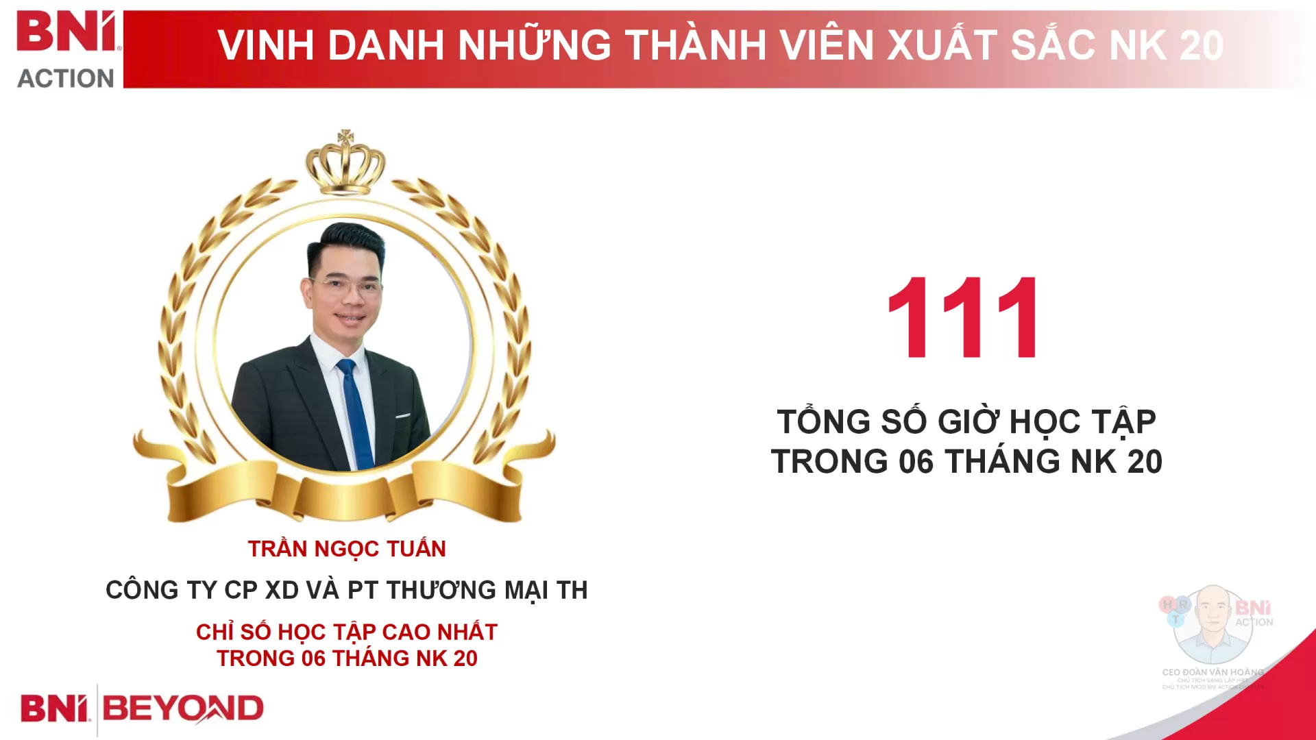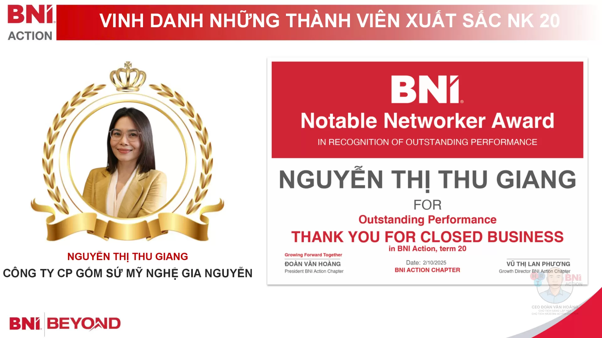 Trong buổi lễ, BNI Action Chapter đã trang trọng vinh danh các cá nhân tiêu biểu – những thành viên không chỉ hoạt động năng nổ mà còn lan tỏa tinh thần học hỏi, cống hiến và gắn kết: