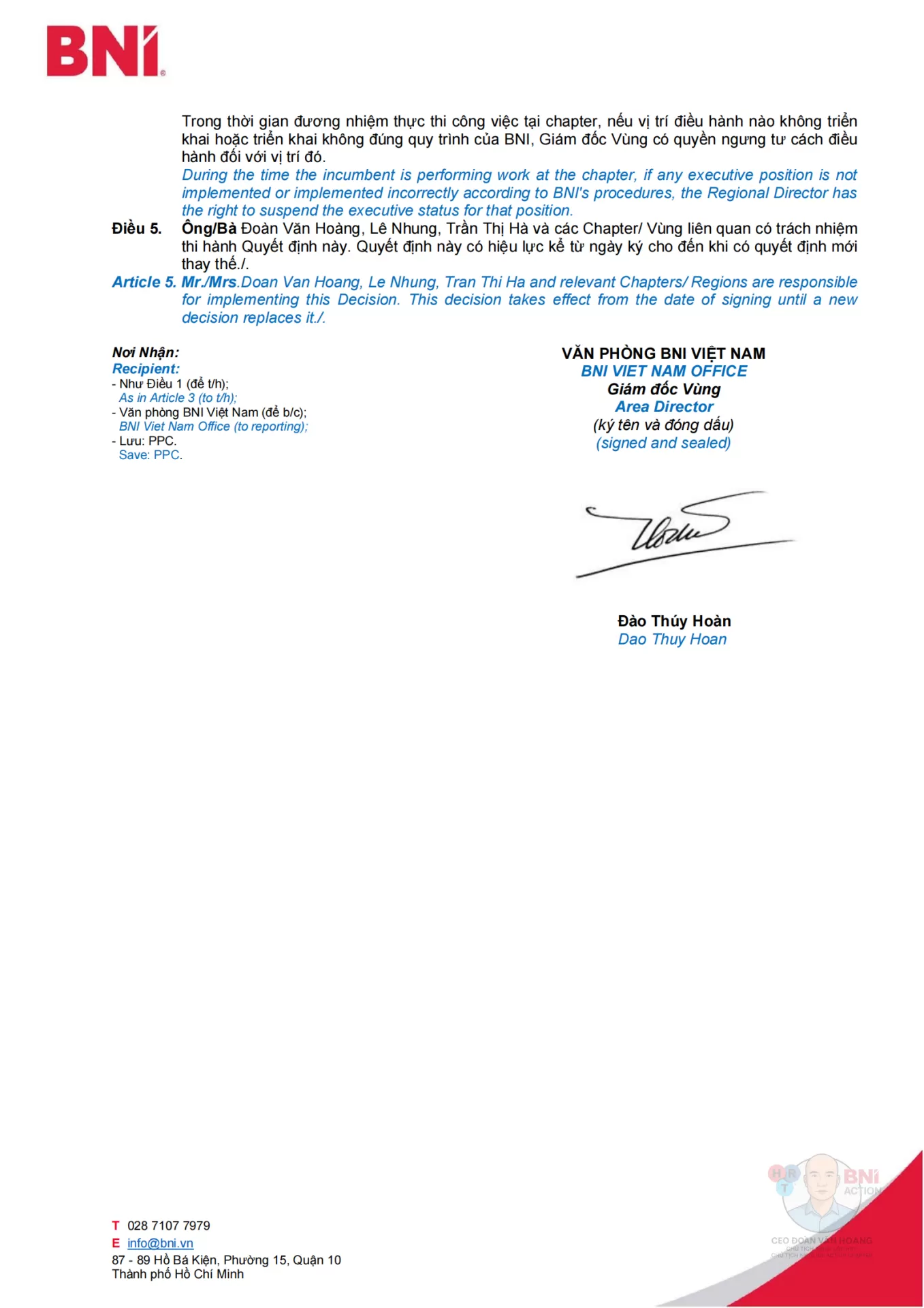 Theo quyết định được ký bởi Giám đốc Vùng BNI Việt Nam – bà Đào Thúy Hoàn, Ban Điều Hành Nhiệm Kỳ 21 của Action Chapter gồm: